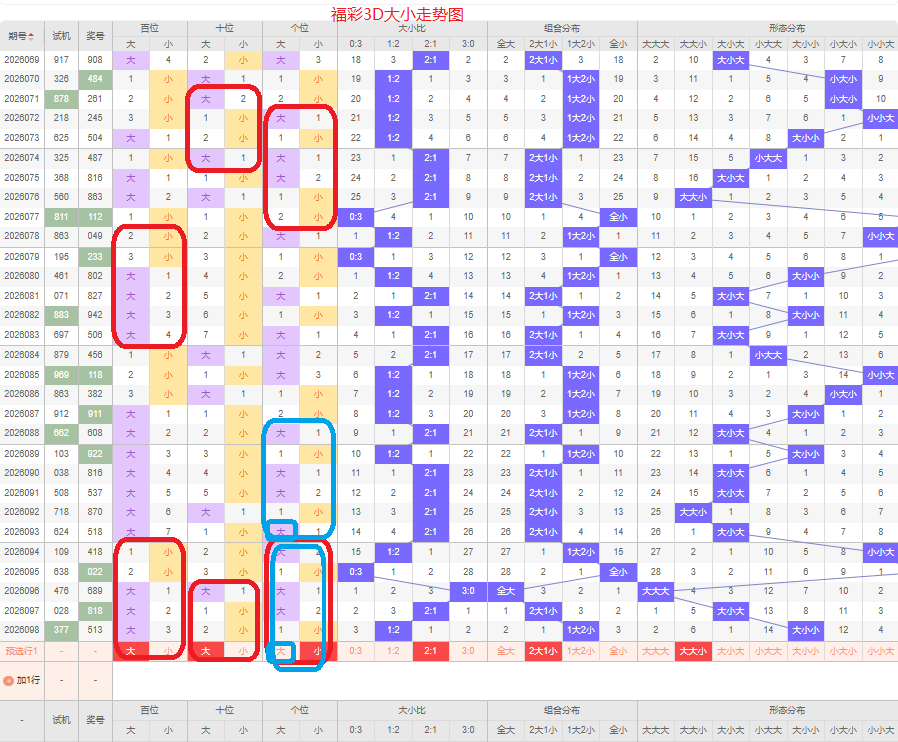 上期大小比为1:2,两小的号码组合方式,从近五期出现情况看,大号码出现7次,小号码出现8次,大小号码出现较平均,本期侧重两大的号码组合,本期百位侧重大号码,十位侧重大号码,个位要侧重看小,侧重大大小或者大大大的号码组合,根据大小做五码定位56789/56789/01234或56789/56789/56789