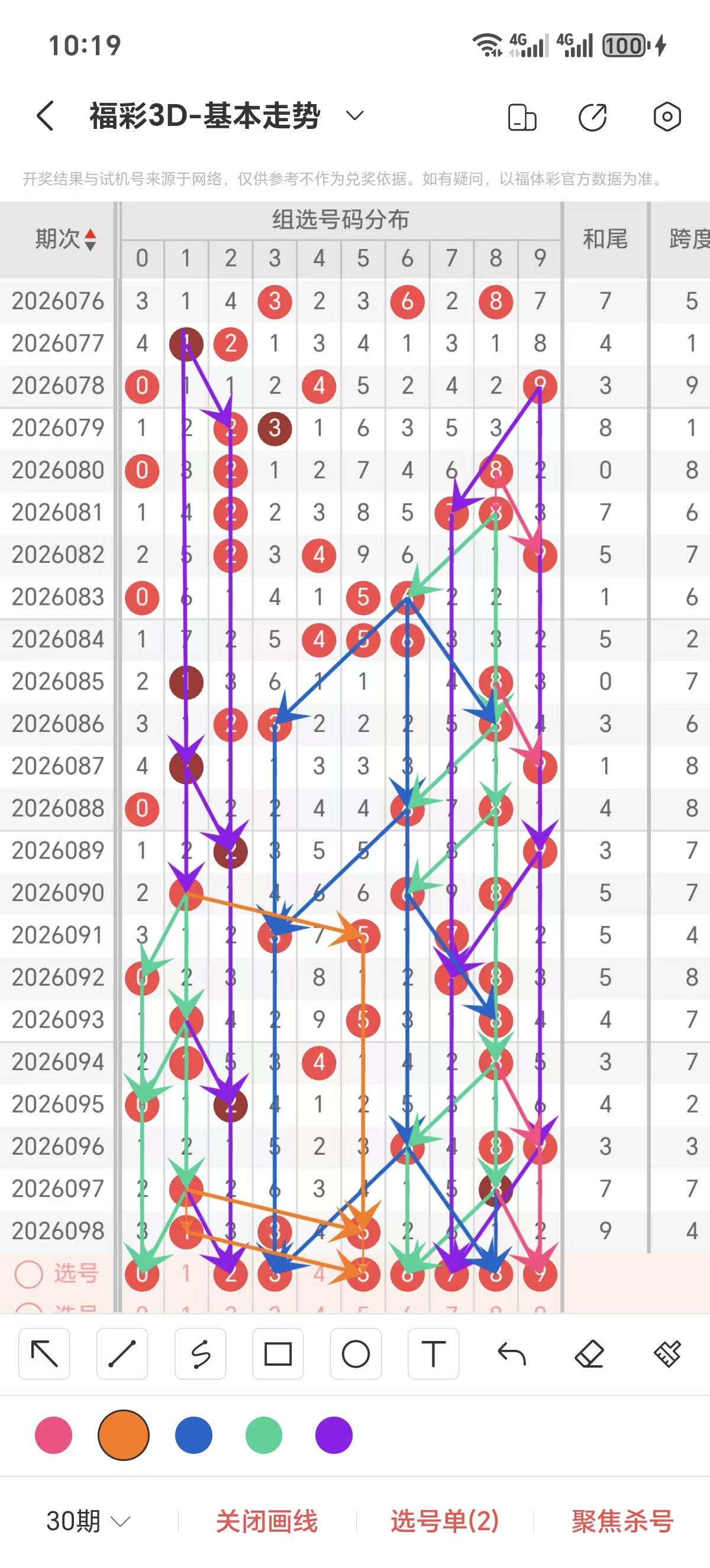跨度通常情况下在五期之内重复一个跨度的概率很高,近五期重复了7的跨度,近五期跨度为7/2/3/7/4,近期1路的跨度较热,上期是1路的跨度,本期要侧重跨度以3/4/6跨为主的号码组合。可以从跨度方面选择相应的双胆码组合,双胆码的选取要根据近期和历史的走势进一步的分析选取。