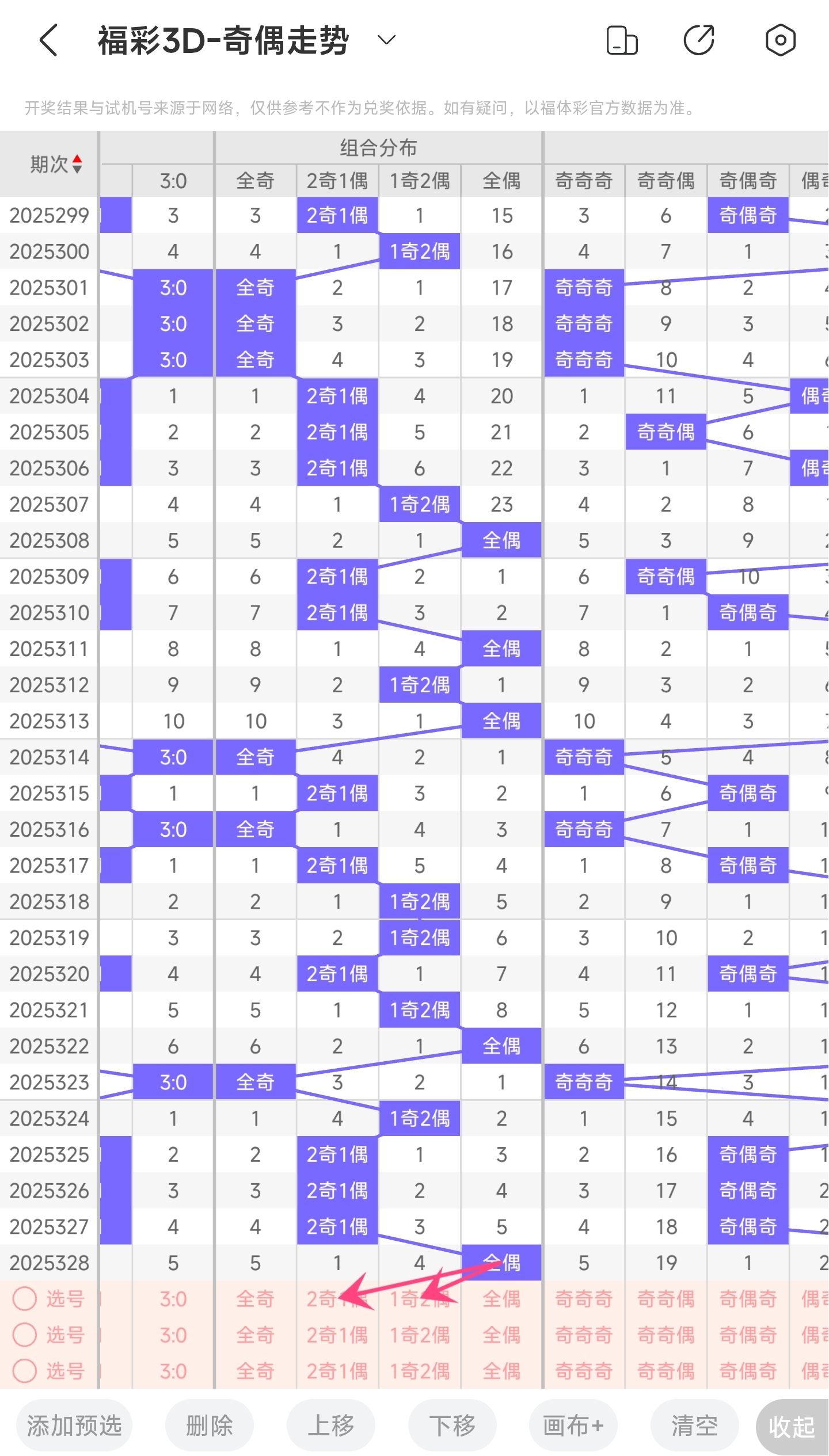 上期开了全偶的情况,往前一期开出的是2奇1偶。从组合数学理论上来讲,开出2奇1偶和1奇2偶的概率都为37.5%,开出全偶和全奇的概率为12.5%。通过分析目前30期内的数据。本期的开出全偶的概率是16.66%,开出全奇的概率为20%,开出1奇2偶的概率为23.33%,开出2奇1偶的概率是40%。和前一期相比,全偶概率变大,1奇2偶概率变小。通过走势图可以看到全偶一般不会连出,所以本期看好1奇2偶回补。所以本期推测可能开1奇2偶,其次是2奇1偶,然后是全奇或者全偶类型。