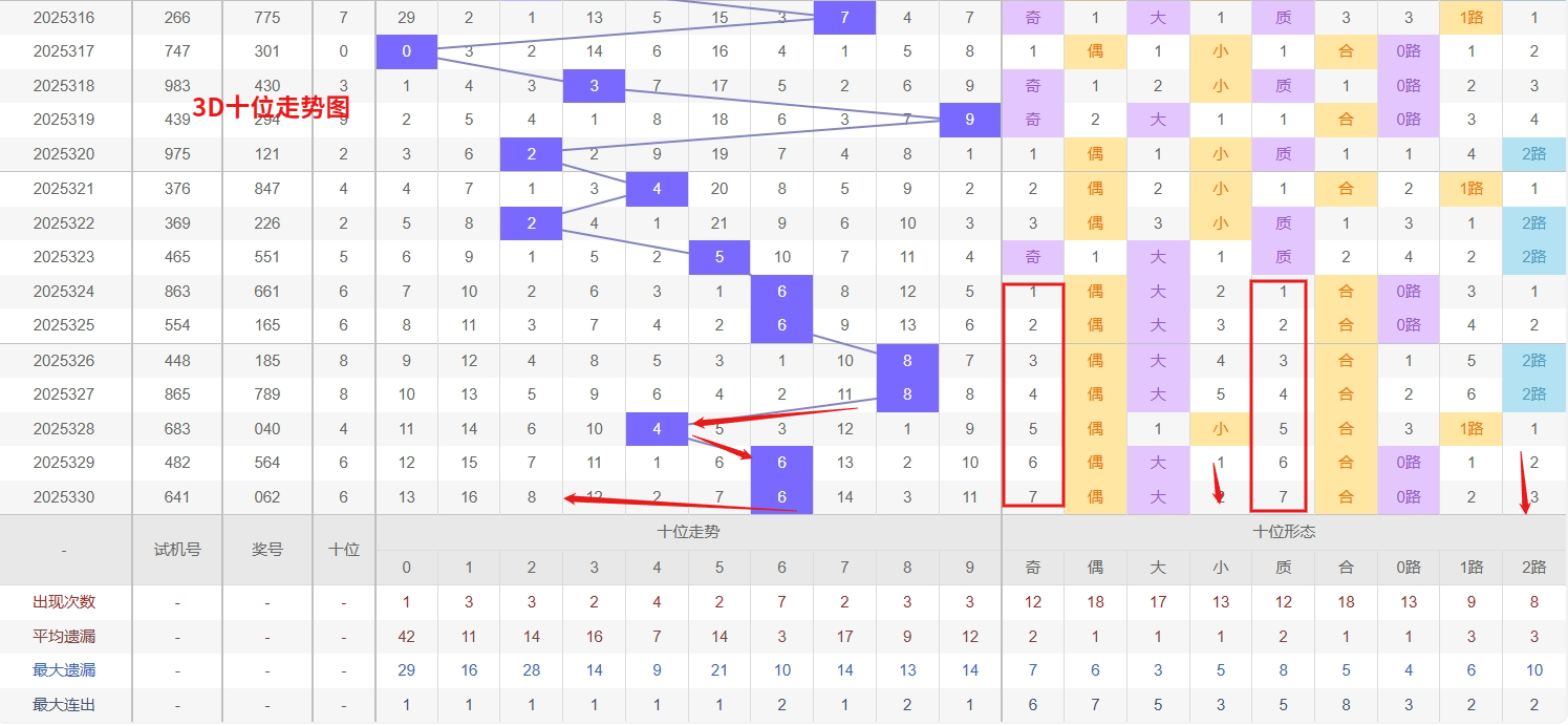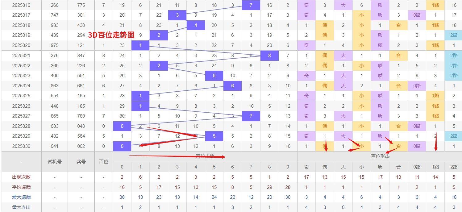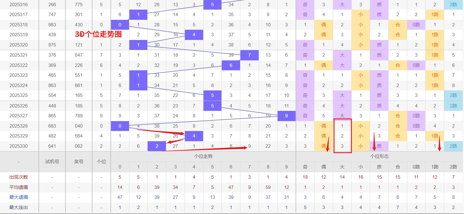 福彩3D个位分析:第2025330期个位开出号码2属于小偶数前端,从以上个位走势图中可以看出近100期的大小比约为54:46奇偶比约为55:45大小奇偶数据上有点差异有需求但不是太明显,不太好看这时就要借助连线走势和遗漏数据来帮助我们缩水号码。上期个位落号“2”小偶数2路号码球,号码开出了2振幅,连续多期的大振必被小振幅取代幅符合我们的预期,那么本期我们在个位考虑振幅走势走前依然要转变思路考虑大振幅,具体考虑(1-5)个振幅是我们主要的方向,那么在对个位落号情况进行系统的分析时我们可以明显的看到个位号码走势呈现大范围震荡,尤其是在号码的落位特点上表现的尤为突出,那么本期我们在个位分析时就要注意号码的风险,避免出现踏空。近期3D个位走势呈现多态交织的格局:数字0持续活跃,形成稳定的热号态势,根据趋势惯性,短期内仍有继续开出的可能,需作为重点防守对象。数字2虽然刚刚解冻开出,但其在开出前经历了较长的遗漏周期,从历史规律看,此类“深冷转热”的号码往往具备一定的延续性,因此2在当前位置出现连下的可能性也需要关注。与此同时,数字3已陷入持续低温,成为当前明显的冷号,随着遗漏值不断积累,其技术性回补的压力正逐步增强。因此福彩3D第2025331期个位看好02379。本文由一起彩钱是生命动力所著,请勿转载