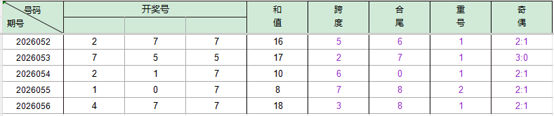 2026056期开奖号码477,我们可以看出近30期百位4出现6次,十位7出现3次,个位7出现5次。
