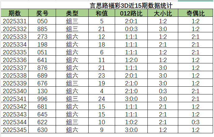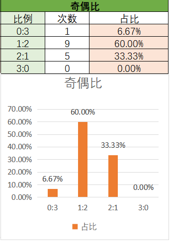 上期奇偶比为1:2,其中1:2占比变大,0:3占比变小。近15期内1:2优势最大,其次是2:1,最后是0:3。上期开了1:2奇偶比,本期看好2:1奇偶比的开出,其次是1:2。