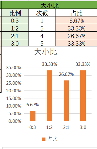 上期大小比为1:2,各个类型占比没有变化。可以看到近15期内3:0和1:2优势最好的,其次是2:1,最后是0:3。本期看好1:2开出,其次是2:1。