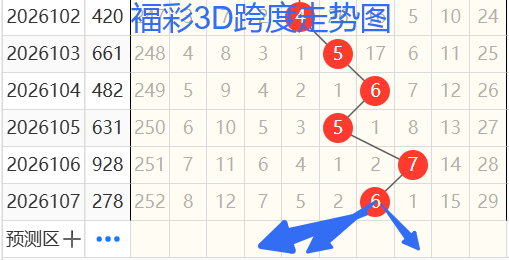 2)我们来看跨度:还是以103期——107期为例,如图依次是56576跨度,按照路数转换关系来看,那么跨度我们暂定147369跨 ,本期个人比较看好3 4 7跨。