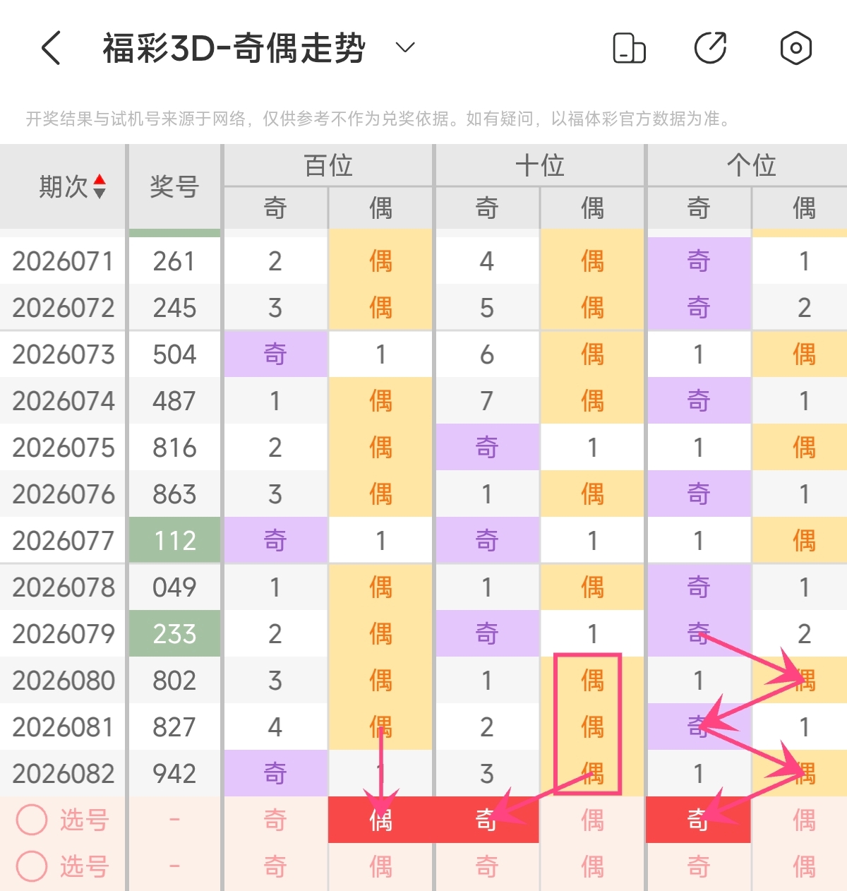 上期奇偶形态为奇偶偶,奇偶比1:2,偶数号码占优。根据近期奇偶形态变化来看,近期