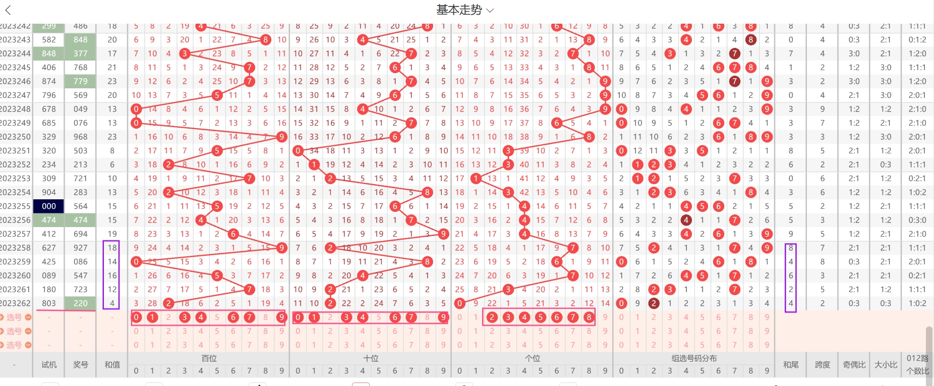 上期回顾:上期开奖号码为220,试机号为803,和值为4,和尾为4,奇偶比为0:3,大小比为0:3,012路个数比为1:0:2.上期分析的单号和值,结果开出组三的双号对子,和值也为双号,这点是没想到的,主要试机号没有组三的提示。昨天的杀码情况还是在杀码中开出的一个胆码,今天是彩市国庆节前的最后一天营业,明天开始放假4天,希望大家今天好运,在节前中个大奖。从上期的开奖信息中,可以看到上期开的组三全是小号,本期从定位上看,这三个位置的小号肯定是往大号上走的,具体就是看一个还是两个往上走。而上期的组三全是双号,本期出单号的可能性极高,也就是说本期有大号,有单号。这是初步的定义。本期还是想从和值的单双看奇偶比。和值双号加上昨天的一期连续开出5期双号了,通常这样的话不应该反着追了,但是从奇偶比的一个走势看,奇偶比0:3和2:1现在基本上趋势已经完成,所以本期主要看3:0和1:2的奇偶比,这两个奇偶比都是和值单号。故本期的重点分析和上期一样。还是看13579,1-02468,3-02468,5-02468,7-02468,9-02468的这几种组合。