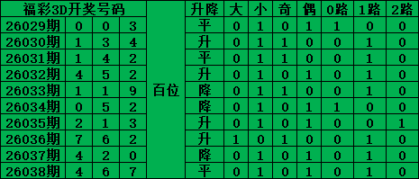 福彩3D是从0-9每期开出3个号码,截至2026038期三个位置最大遗漏的是43期的:百位的8号。