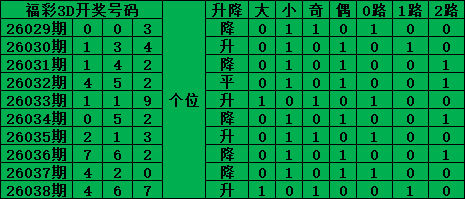 奇偶比:4:6,本期选择奇:1/3/5/7/9号。