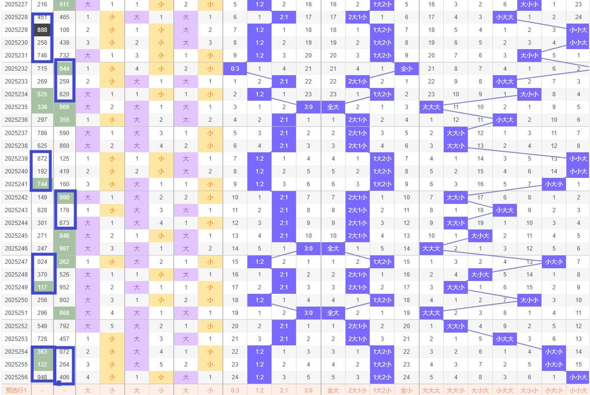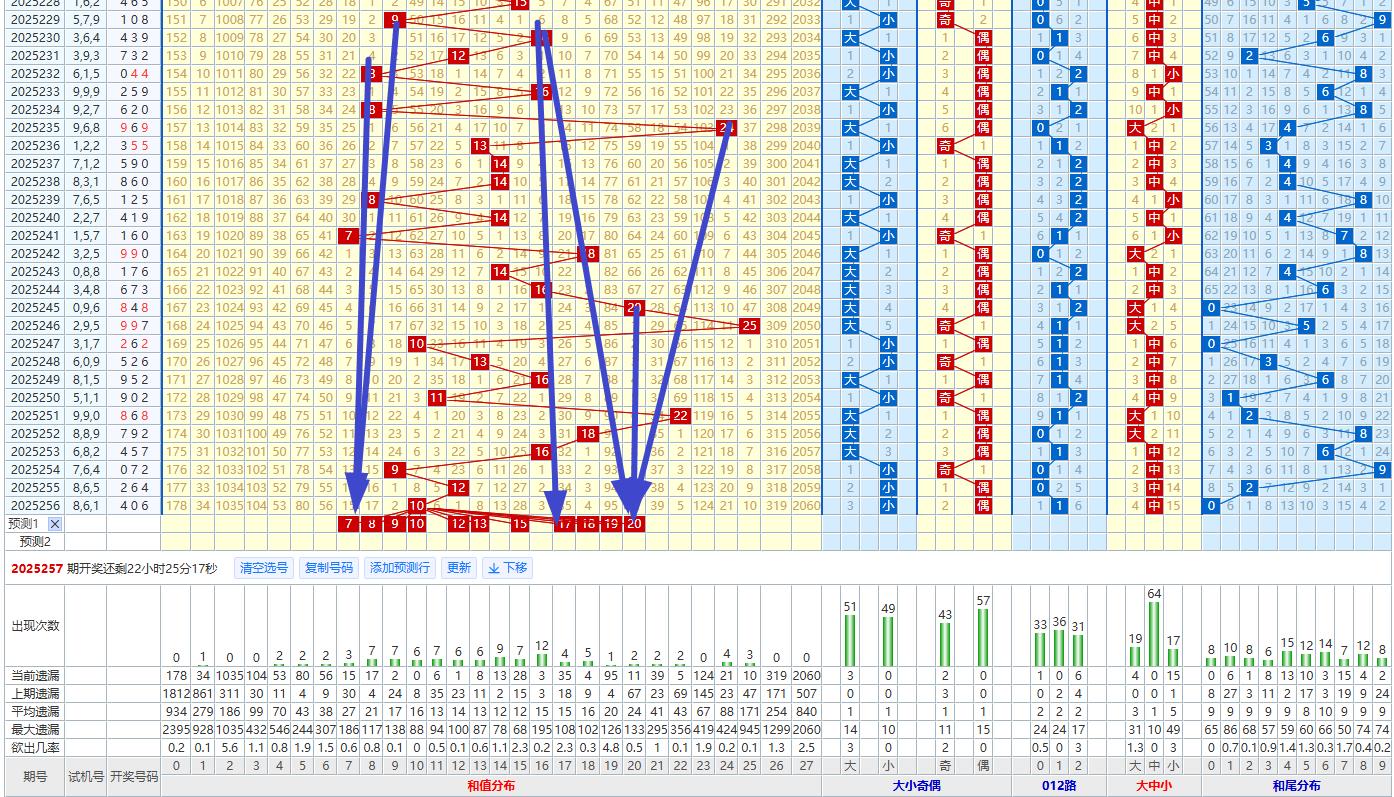 和值预判分析 基于256期的开奖号码为406和值范围及平均值,预测第2257期的和值范围如下: - 推荐和值范围在7至19之间,这一区间内和值出现的可能性较大。 - 彩民在投注时,可根据此范围进行灵活选择,但需注意和值波动的可能性。7.8.9.10或13.15.17.18.19.20.