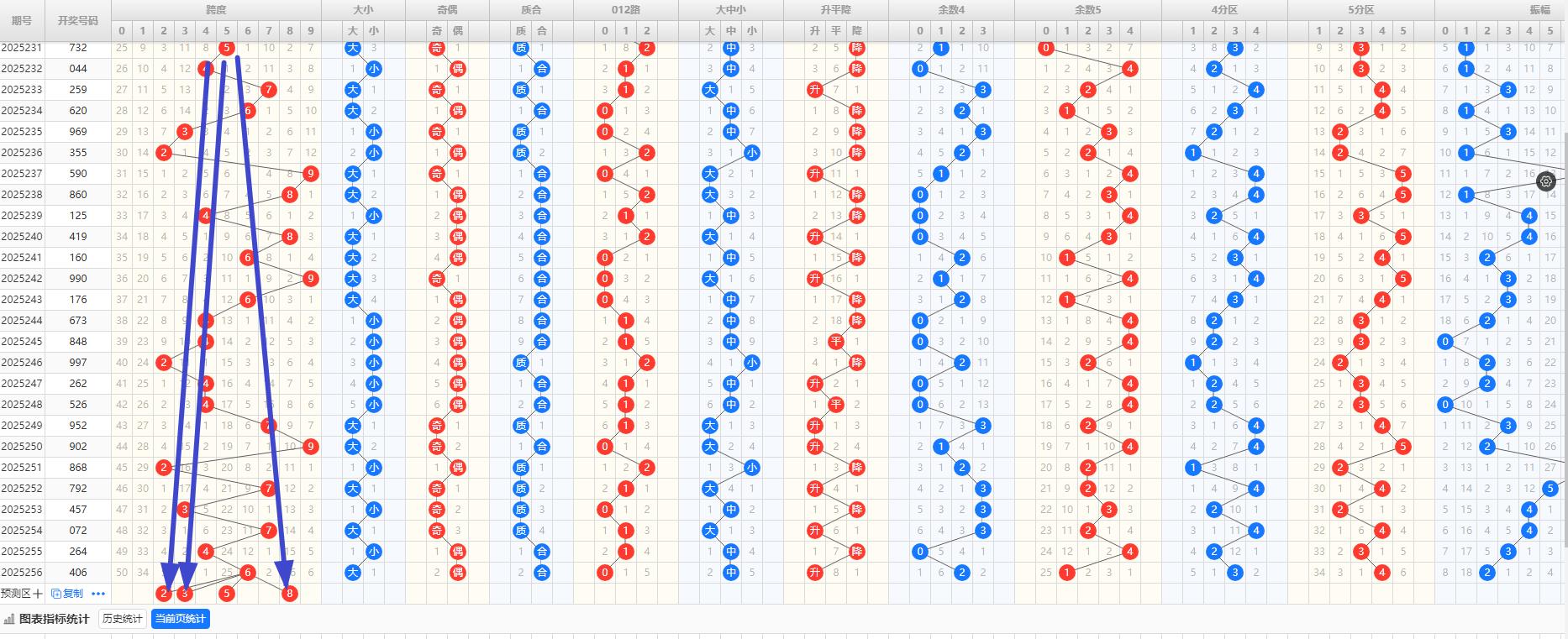 跨度分析 根据近10期的跨度走势及012路、奇偶比、大小比的综合分析4-4-7-9-2-7-3-7-4-6,012路比为3:6:1得出以下结论: - 本期重点关注2路跨度,特别是跨度2.3.5..8.这几种跨度在历史数据中具有较高的出现概率。 - 同时,也需留意偶数跨度和小数跨度的出现,但需注意其出现频率的波动性。跨度3.5.8的概率很大