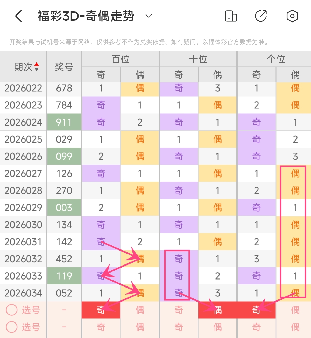 预计本期可关注奇偶比2:1,奇数占优组合 。本期奇偶形态可重点关注:奇偶奇。