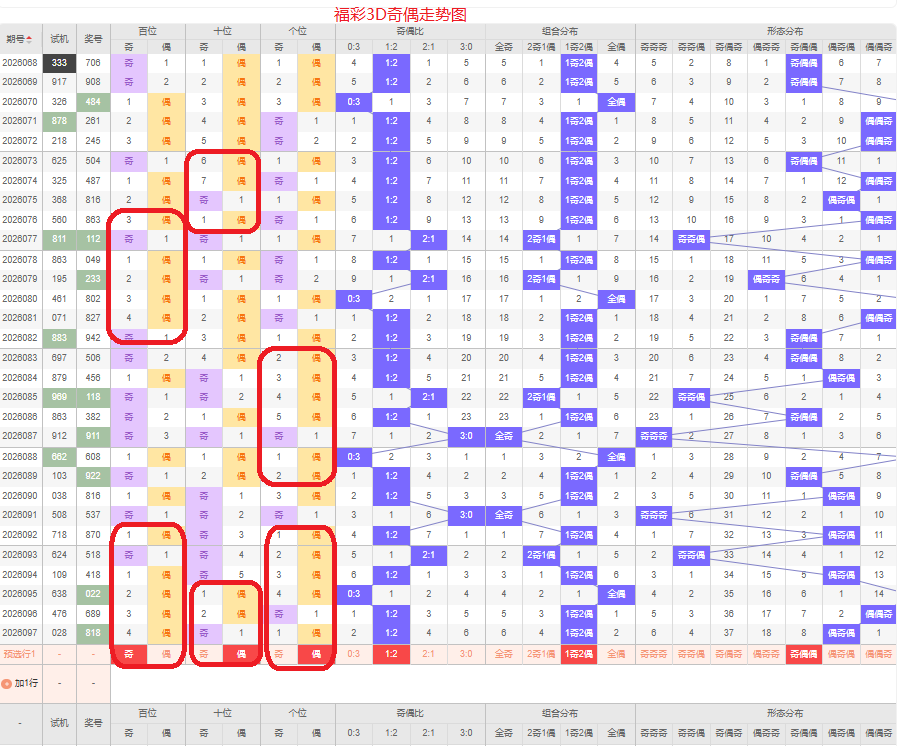 上期奇偶比是1:2,两偶的号码组合方式,从近五期的奇偶数出现情况看,奇数出现5次,偶数出现10次,奇数号码出现较少,本期侧重两偶的号码组合,侧重奇偶偶或奇偶奇的号码组合方式,根据奇偶形态做五码定位13579/02468/02468或13579/02468/13579