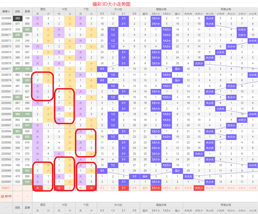 上期大小比为2:1,两大的号码组合方式,从近五期出现情况看,大号码出现8次,小号码出现7次,大小号码出现较平均,本期侧重两大的号码组合,本期百位侧重大号码,十位侧重大号码,个位要侧重看小,侧重大大小或者大小小的号码组合,根据大小做五码定位56789/56789/01234或56789/01234/01234