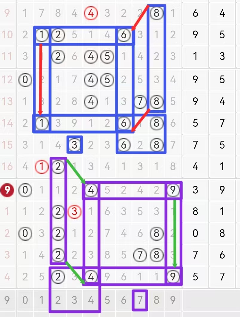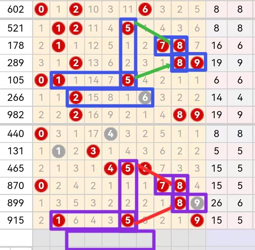 这是历史走势分析,蓝色划线坐标5空两格落5,中间夹78 89组合半顺再出15差4组合再向下开266全双组合!