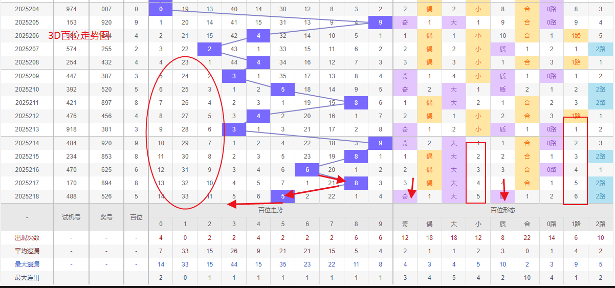 福彩3D百位分析:第2025218期百位开出号码5属于大奇数,从上面百位走势图上可以看出近100期大小比约为48:52奇偶比约为54:46。近期数据还是比较极端的符合文章开头介绍的求均衡规律非等量现象。但这种均衡不会持续最终会被偏态运行打破,然后循环往复。但短期内大小相差3点,小数过热大数有回补需求本期个人认为走大数的概率更高。上期百位落号“5”号球,在百位号码开出2路号码5后向小数方向走出3个振幅。那么通过分析上期百位落位号码分析,号码走出3个振幅,号码走为大奇数,开出2路号码5。通过对百位落号趋势来分析,百位号码落位中端,通过对近10期的走势来看百位号码大小交替频繁走2期大数又走3小数,最近小数比较强势,本期有走向小数号码的概率。那么本期我们在对百位号码进行分析时我个人的考虑百位号码会走出小数号码球,近期3D百位走势中,数字1和7明显进入冷态,尤其是1已经遗漏长达33期,远超其理论出现周期,回补需求极为强烈。从历史数据来看,百位数字1的平均遗漏值通常在15期左右,当前冷态已达到临界点,随时可能触底反弹;而数字7虽然遗漏期数稍短,但也进入偏冷区间,配合百位奇偶交替的走势特点,同样具备较强的回补潜力。与此同时,数字0近期表现活跃,属于热号范畴,在关注冷号回补的同时也需防范热号延续,我们在百位关注的重点在01367这5个号码球上,百位号码近期奇偶切换频繁,5号球码属于2路号码奇数,现奇数开出过多有继续向奇数的趋势。所以福彩3D第2025219期百位看好01367。