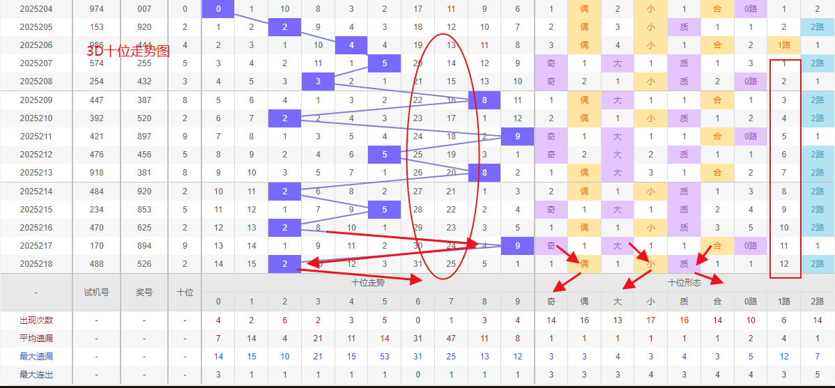 福彩3D十位分析:第2025218期十位开出号码2属小偶数号码前端。以历史100期数据为例十位奇偶比约为53比47,大小比约为52比48近期大小相差7点,根据求均衡的规律开出小数的概率比大数高一点。上期我们分析奇数经过连续回补后有走偶数的可能,开出奖号2小偶数符合我们的预期。近期3D十位走势中,数字6和7已形成明显冷态,其中6遗漏长达31期,7也连续25期未出,双双进入强势回补周期。从历史数据看,十位数字6的平均遗漏值通常在12-15期左右,当前遗漏期数已超过两倍标准差,反弹迫在眉睫;而数字7虽然遗漏稍短,但也远超其理论出现频率,配合十位近期奇偶交替的走势特征,同样具备极强的回补动能。与此同时,数字0近期表现异常活跃,成为十位当之无愧的热号,在重点关注6、7冷号回补的同时,也需警惕0的持续热出可能。采取"冷热结合"的投注策略,主攻6、7这两个深度冷号的回补机会,同时适当防范0的热号延续,所以福彩3D第2025219期十位推荐40678。