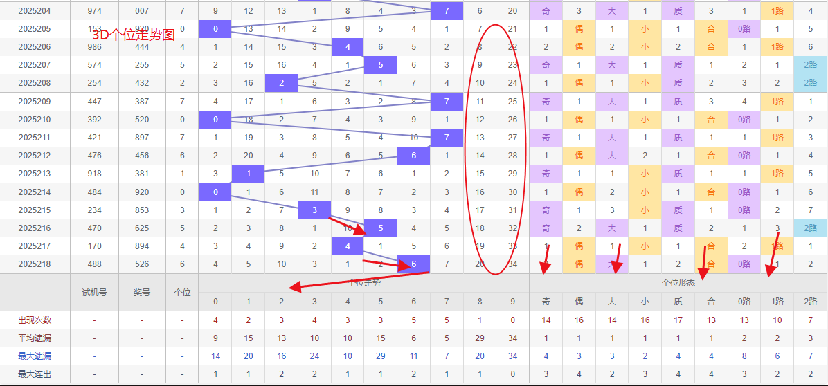 福彩3D个位分析:第2025218期个位开出号码6属于大偶数中端,从以上个位走势图中可以看出近100期的大小比约为46:54奇偶比约为52:48大小奇偶数据上有点差异有需求但不是太明显,不太好看这时就要借助连线走势和遗漏数据来帮助我们缩水号码。上期个位落号“6”大偶数0路号码球,号码开出了2振幅,连续多期的大振必被小振幅取代幅符合我们的预期,那么本期我们在个位考虑振幅走势走前依然要转变思路考虑大振幅,具体考虑(2-5)个振幅是我们主要的方向,那么在对个位落号情况进行系统的分析时我们可以明显的看到个位号码走势呈现大范围震荡,尤其是在号码的落位特点上表现的尤为突出,那么本期我们在个位分析时就要注意号码的风险,避免出现踏空。近期3D个位走势中,数字8和9已进入明显冷态,回补需求逐渐增强。其中8的遗漏期数已达20期以上,9的遗漏也接近历史平均水平,从概率分布来看,这两个数字正处于蓄势待发的状态。特别是8作为个位冷号,其理论出现频率与实际遗漏形成明显反差,随时可能迎来强势反弹;而9在个位的历史表现往往呈现周期性特征,当前冷态也接近临界点。与此同时,数字3近期表现活跃,成为个位当之无愧的热门号码,在关注8、9回补的同时,必须警惕3的持续热出可能。从走势规律来看,个位近期呈现冷热交替的特征,采取"冷号为主、热号为辅"的投注策略,重点把握8、9这两个冷号的回补机会,因此福彩3D第2025219期个位看好23189。