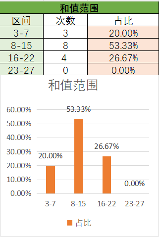 上期和值是12,处在8~15之间,其中8~15占比变大,3~7占比变小。目前是8~15占比最优,其次是16~22,最后是3~7。本期看好和值在8~15之间,其次是16~22。