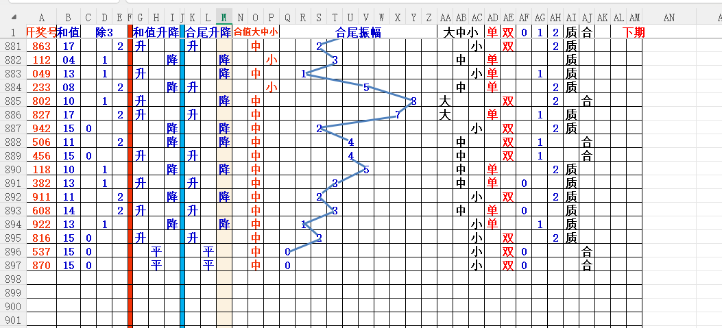 如上图3,和值升降平分析,和值升概率大,小于15和值