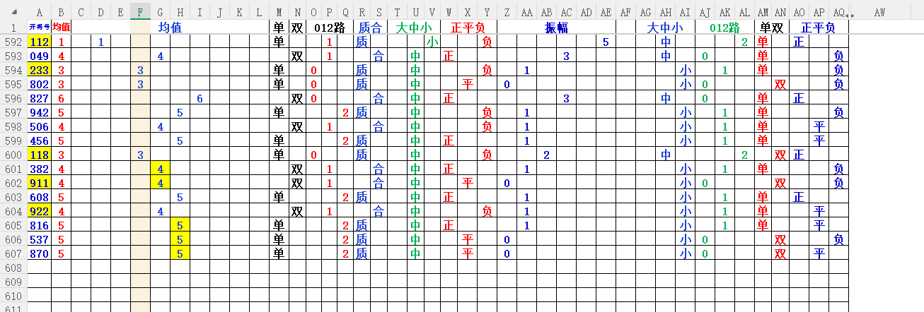 均值:就是开奖号每各数的总和除3,然后得到的余数,如果不够整除可以+1,-1,直到被整除得的数就是均值