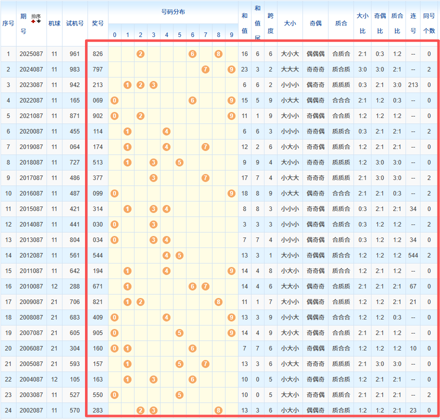 4、通过上述我们得到这期百十个位分析号码:百位2,十位14、个位025789