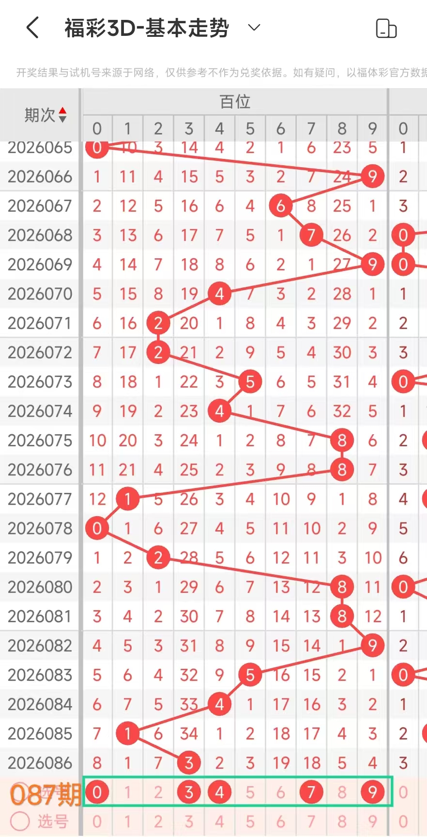 3、当个位开出2后下期开出:088525293007976,经统计0号出3次、1号出现0次、2号出现2次、3号出现1次、4号出现0次、5号出现2次、6号出现1次、7号出现2次、8号出现2次、9号出现2次。观察发现025789号出现频繁,本期可以考虑。