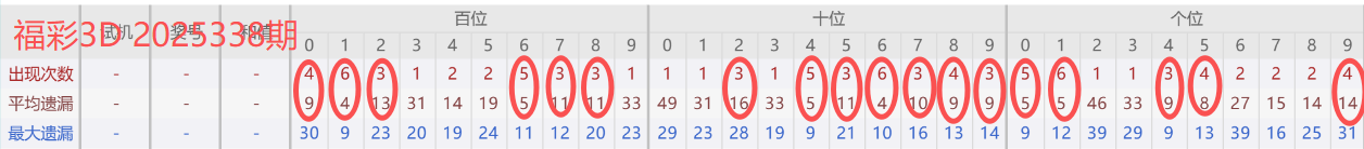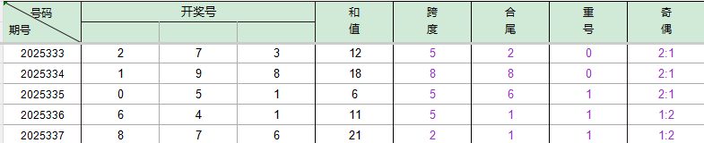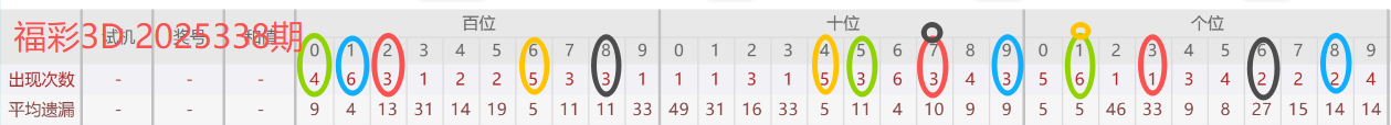 2025337期开奖号码876,我们可以看出近30期百位8出现3次,十位7出现3次,个位6出现2次。
