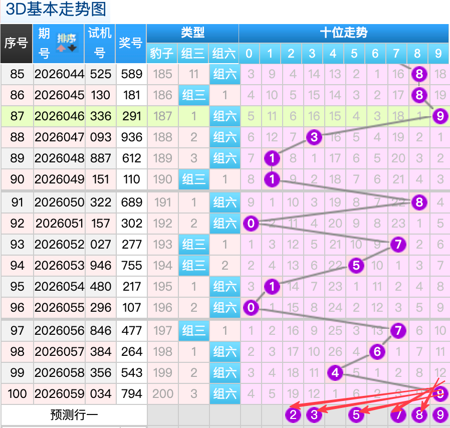 上期3D十位开出的奖号是9号,上期在十位上9号球这个号码是一个冷号码的回补落位点,本期来看5号在十位上要注意这个号码是有机会继续顺着上期的9号球继续走出4跨号码的落位趋势这里的号码回补的落位形态注意防守就好,再来看7号球这个点位注意防守。9号球的重码要注意参考4号球是折返号要注意参考。