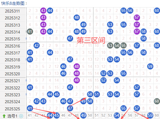 三区间开出了4个奖号(41.47.55.57)上期回顾三区开出4个奖号上期的三区间的奖号数量呈现一个递减的形态,4头回补2个,本期先来看号码44近期出现频率相对来说还是很稳定。偶尔有时间隔期数也是很长,说明其在近期的开奖中较热的,号码49在近 30 期内出现次数相对还不是稳定的号码,近期的活跃度也是较温冷。号码54有一定的间歇性,通常间隔5-3期会出现一次,没有明显的连续出现态势,走势相对较,在整个第三区间的表现本期还是可以防守的。号码59走势相对近期较温热近期没有连续间隔落号的情况,活跃度近期处于不是很稳定状态注意防守。