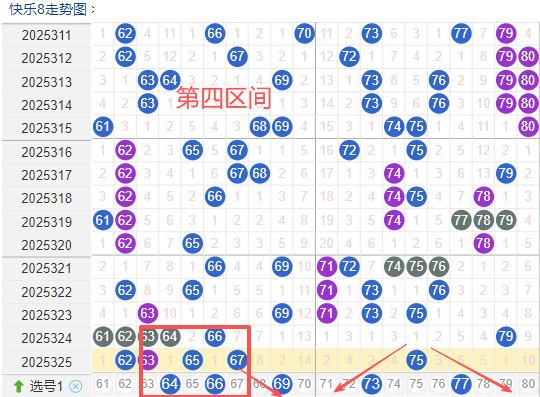 上期四区间开出了5奖号(62.63.65.67.75)上期的四区开5个奖号呈现了一个递减的趋势,开出的奖号7头回补1个,6头开也是回补了4个,先来看号码64在近 30 期内属于是较冷的号码,近期出现频率相对还是比较,偶尔会间隔多期后出现一次,这个号码要注意防守,号码69具有一定的间歇性活跃度较比如有时会间隔 3到4期就再次出现,也有时会间隔多期,近期整体出现频率比较,近期还是要关注的.号码73活跃度近期比较,有一定的间歇性。活跃度近期算稳定,整体走势有一定的波动性.