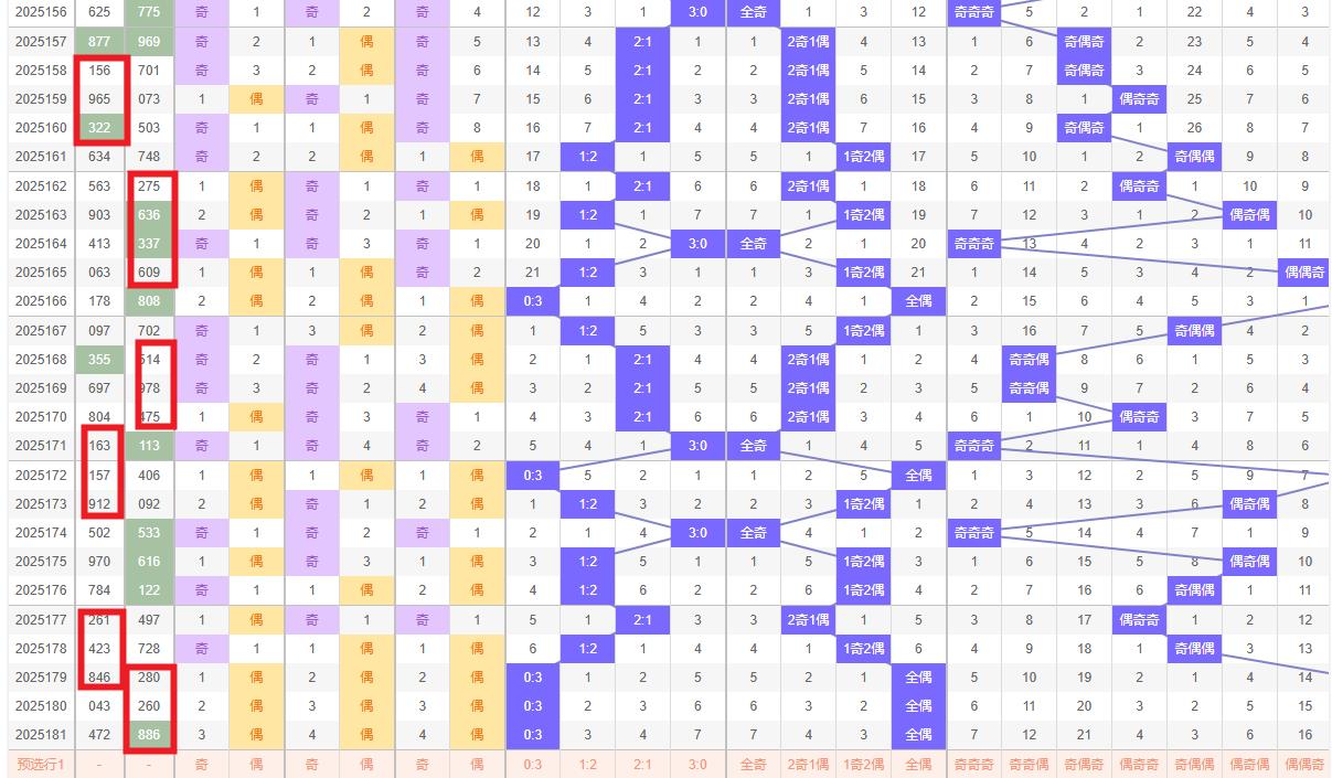 奇偶比例分析 181期的奇偶比为0:3,偶数占据主导地位。在奇偶比例的分析中,同样注重平衡原则。考虑到近期奇偶比的波动,可以预判182期的奇偶比例将继续保持平衡,即可能为2:1或1:2。这样的预判不仅符合历史数据的统计规律,也体现了奇偶比例在短期内的调整趋势。