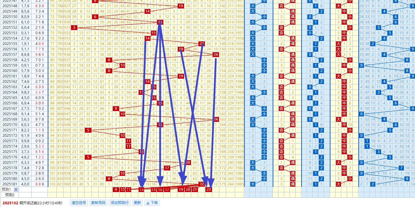 和值预判分析: 181期的和值为22,这是一个相对较大的和值。在和值走势的分析中,注重和值的波动性和稳定性。考虑到近期和值的波动范围,我们可以预判182期的和值将在11到23之间波动。这样的预判不仅符合和值的波动性规律,也体现了和值的稳定性原则。和值预判为9、10、11、12.13、15、16、17、19、20、21、23.