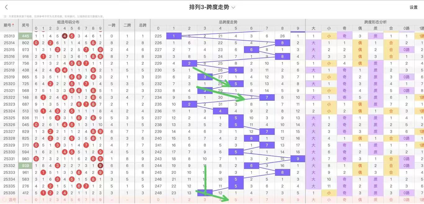10期内跨度走势为:7-6-7-5-9-6-8-5-5-3,10期内大小跨比:9:1,奇偶跨比7:3,百期内跨度3共开出的16次,下期数据:2 7 5 6 7 9 2 8 4 5 3 5 9 5 7 近期度较热,考虑跨度3开出后容易出大跨度,近期大小规律下小:偶:合,所以接下来继续小跨,偶跨度表现!