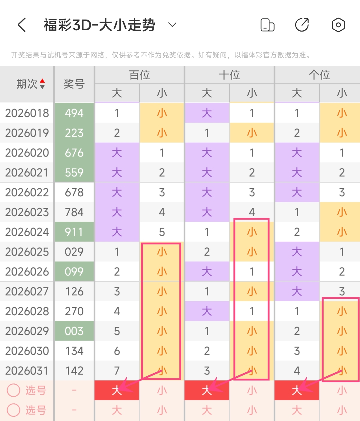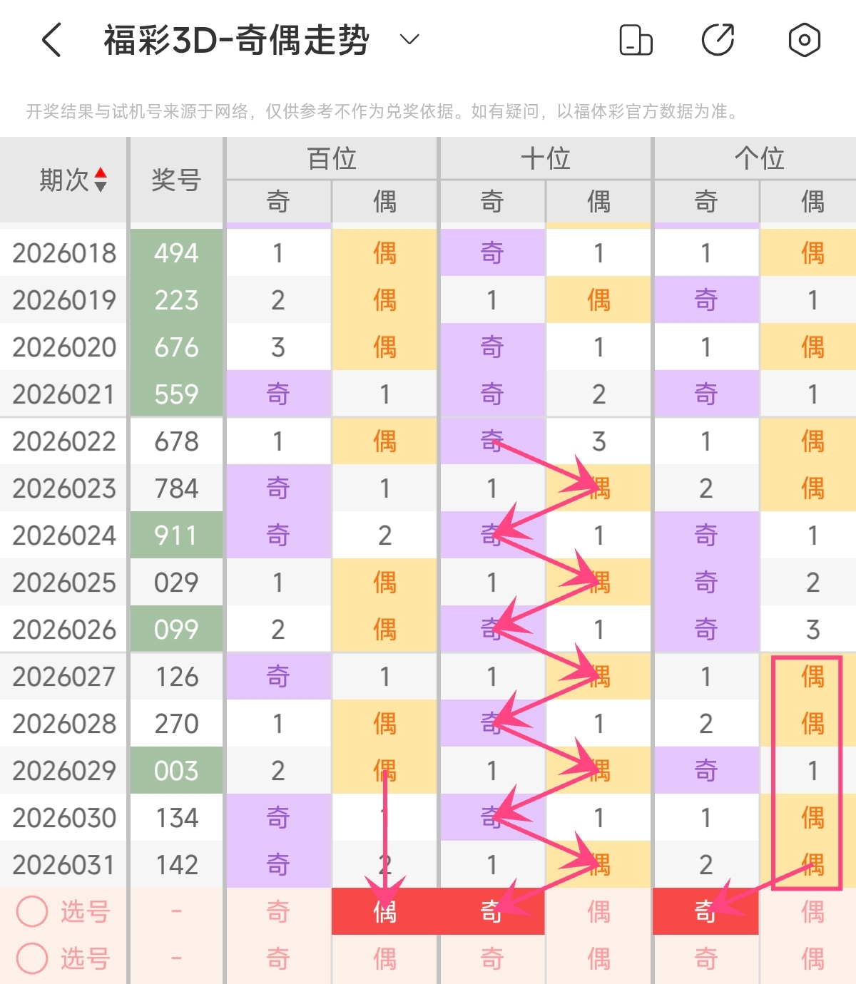 首先让我们回顾一下上期福彩3D第2026031期开奖号码为142 ,为组六形态,大小比为0:3,奇偶比为1:2,跨度为3,和值为7。
