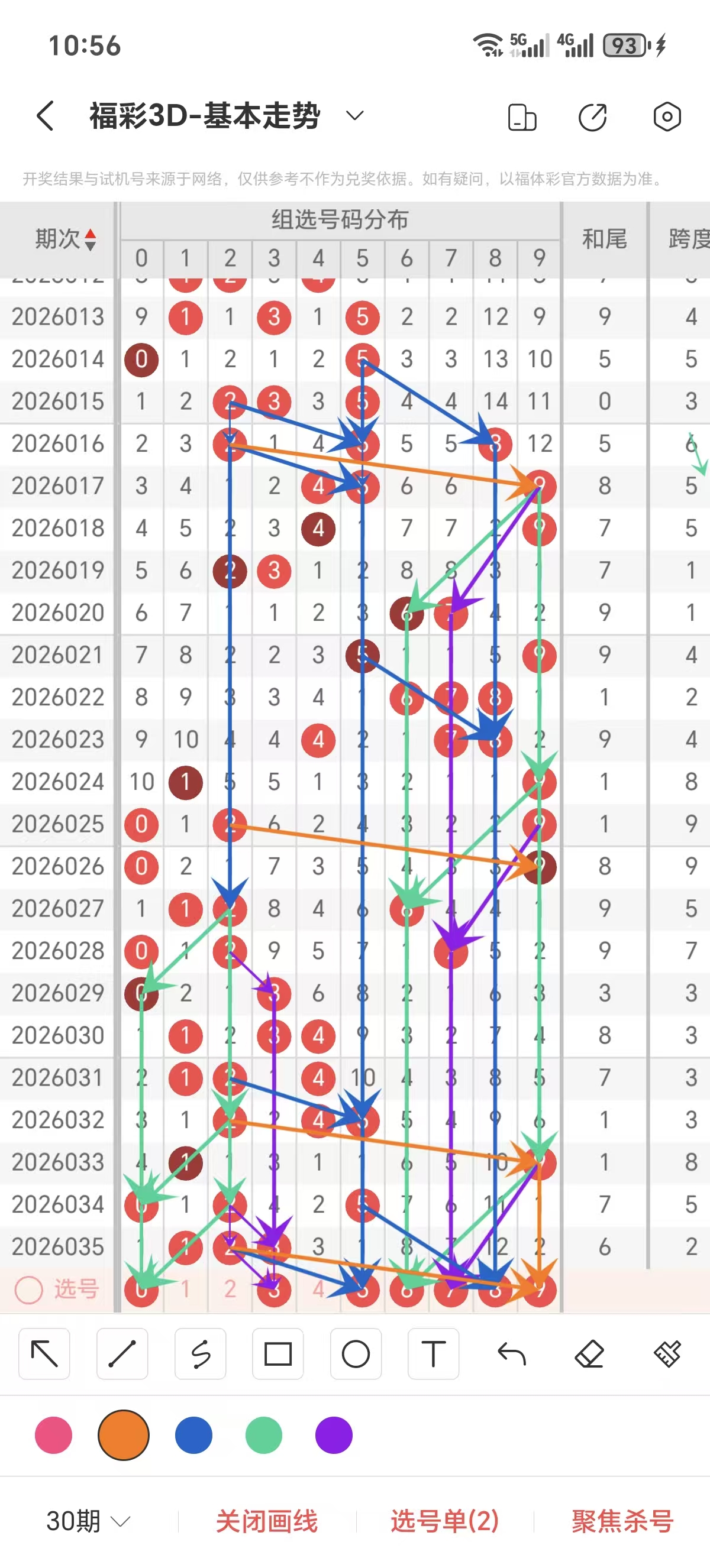 跨度通常情况下在五期之内重复一个跨度的概率很高,近五期重复了3的跨度,近五期跨度为3/3/8/5/2,近期02路的跨度较热,上期是2路的跨度,本期要侧重跨度以4/7/9跨为主的号码组合。可以从跨度方面选择相应的双胆码组合,双胆码的选取要根据近期和历史的走势进一步的分析选取。