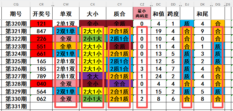 3,最近10天当中,两质一合开出3次,两合一质开出5次,全质数开出1次,全合数开出1次。近期需重点关注开奖号码两质一合的回补!