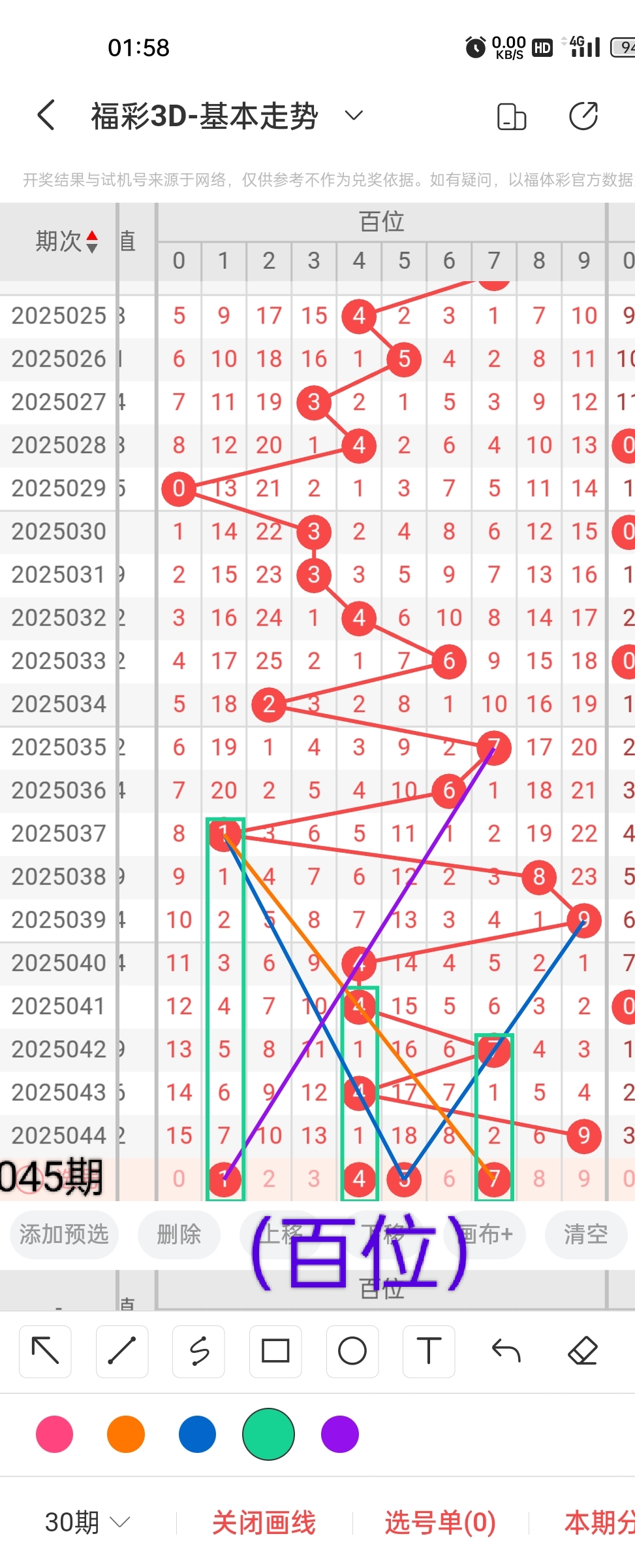 首先,小梁给大家分享一个福彩3D杀百位的小技巧,本期尾号乘以3加3后取个位杀本期百位,准确率高达95.36%。根据这个小技巧,本期杀百位:8。其次,我们根据图中画线的思路可以看出,号码1与前几期开出的号码呈斜三连的走势且呈隔七期回补的走位,跨度为8;号码4与前几期开出的号码4呈连续隔期回补的走势,跨度为5;遗落18期未出的号码5与前几期开出的号码呈左右两条斜三连的走位,跨度为4。然后,如图所示,号码7与前几期开出的号码呈斜三连的走位且呈隔两期回补的走势,跨度为2。综上所述,小梁预测百位开出的号码为1、4、5、7。