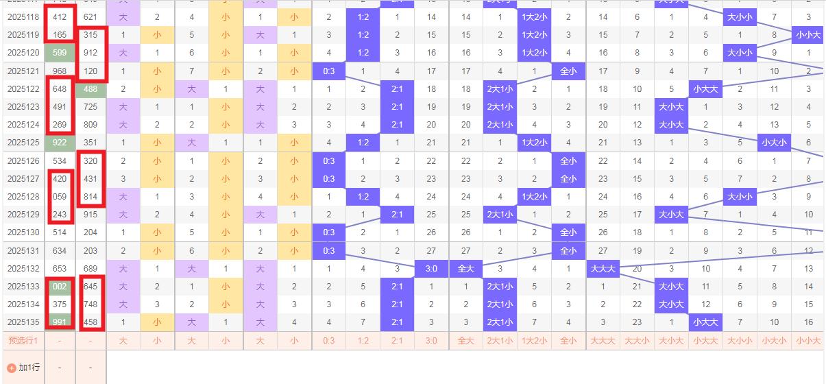 大小走势分析: 在福彩3D的大小走势中,近期数据显示大小组合分布较为均衡,但细致观察历史数据,我们发现大小组合呈现出一定的周期性变化。例如,第24305期的“组三”(两个小一个大)与第24306期的“组六”(两个大一个小)交替出现,这种交替模式在一定程度上反映了大小号码的互补性。因此,对于第136期预测大小比例可能为1:2或2:1。考虑到近期大号略有增多,建议重点关注大小比例为1:2的组合,即两个小号搭配一个大号。