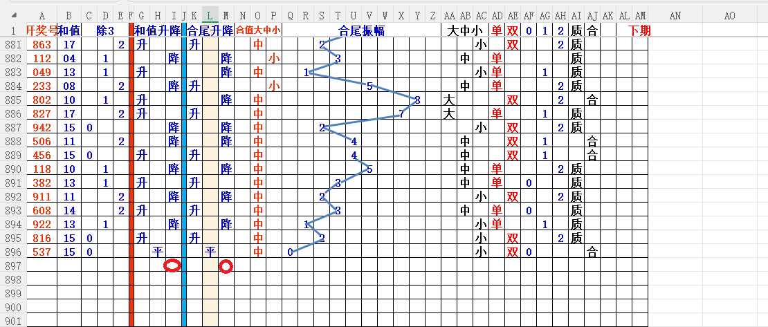 如上图3,和值升降平分析,和值升概率大,小于15和值