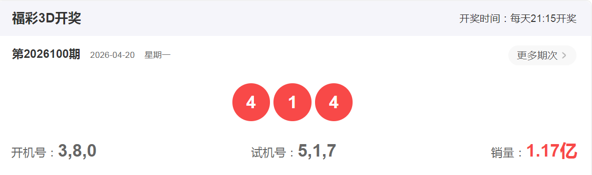 福彩3D2026年4月20日第100期开奖号码是414,和值9,跨度3,小小小,组三形态,偶奇偶