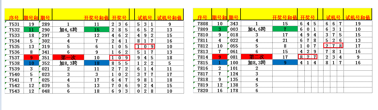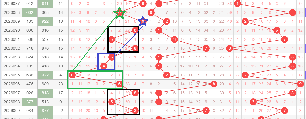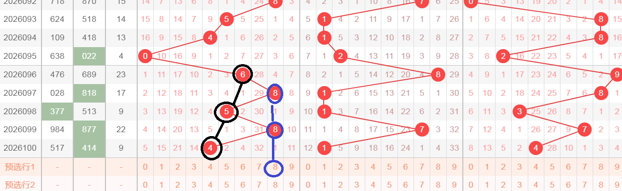 这是一张百位的走势图,在百位开出了黑颜色858,一共开出了两个黑颜色858,在第一次858的上期开出了一个蓝颜色星9,在下期蓝颜色开出了54,5和4相加就等于上面蓝颜色星9,接着在上期绿颜色星6,在下期开出了绿颜色06,0和6相加就等于上面的星6,那么轮到今天,在第二次黑颜色框858的下期先开出了一个4,那么4加2才能等于上面的6,文字表达可能不太清楚,大家可以观看上面的视频