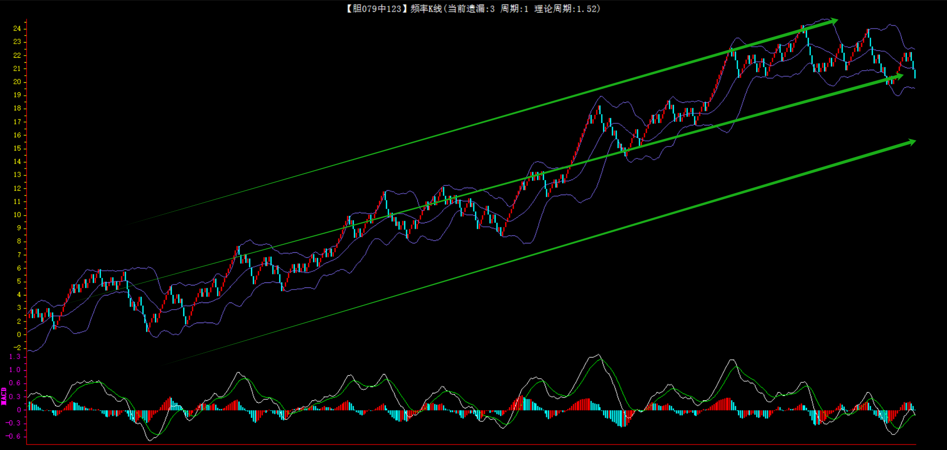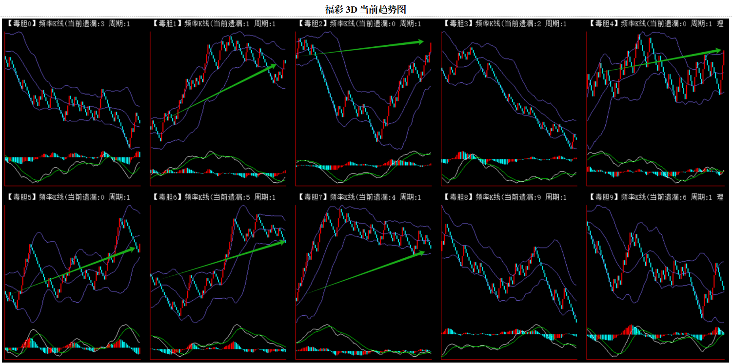 整体趋势上行,上边沿线趋势向上,下边沿趋势也是向上,节点震荡,当前遗漏3期,本期关注。