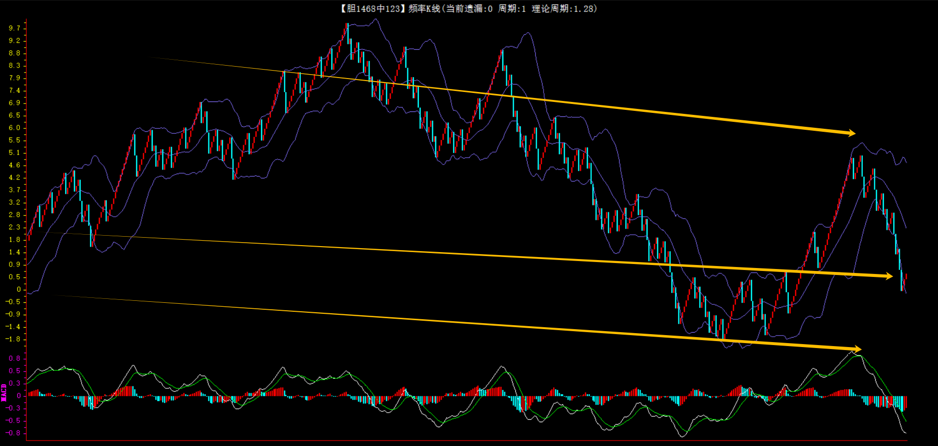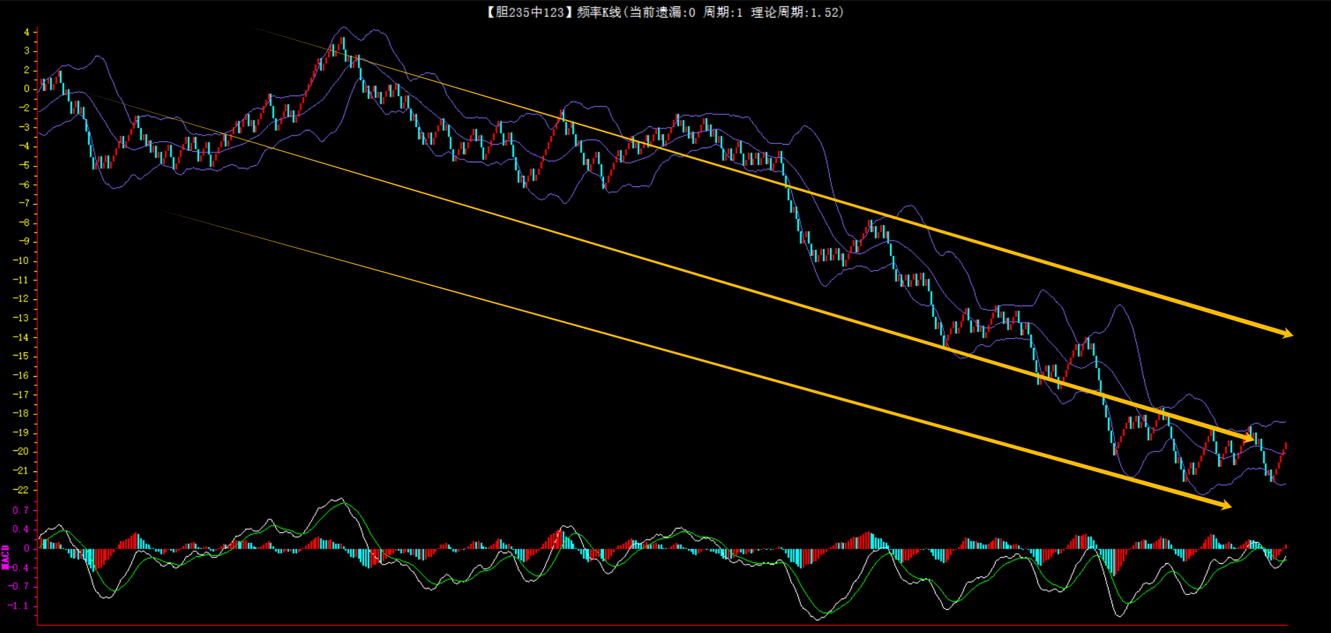 整体趋势下行,上边沿线趋势向下,下边沿趋势也是向下,节点震荡,当前连开3期,本期防守。