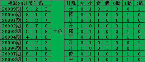福彩3D是从0-9每期开出3个号码,截至2026098期三个位置最大遗漏的是31期的:十位的9号。