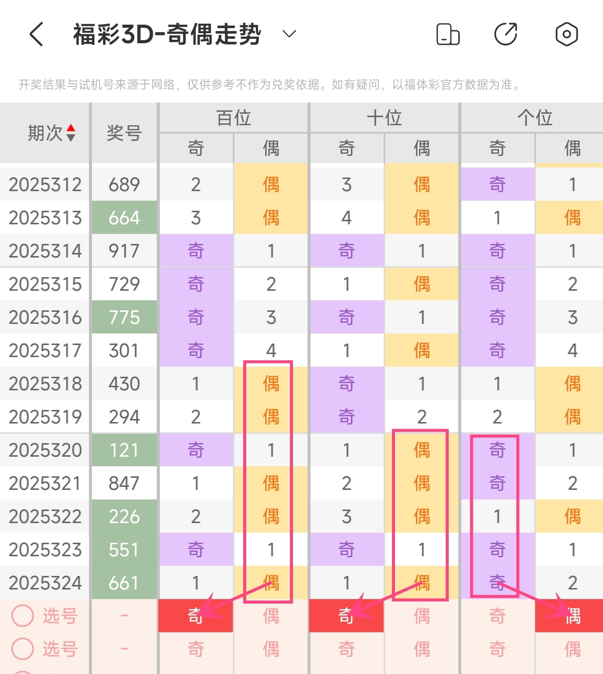 首先让我们回顾一下上期福彩3D第2025324期开奖号码为661,为组三形态,大小比为2:1,奇偶比为1:2,跨度为5,和值为13。