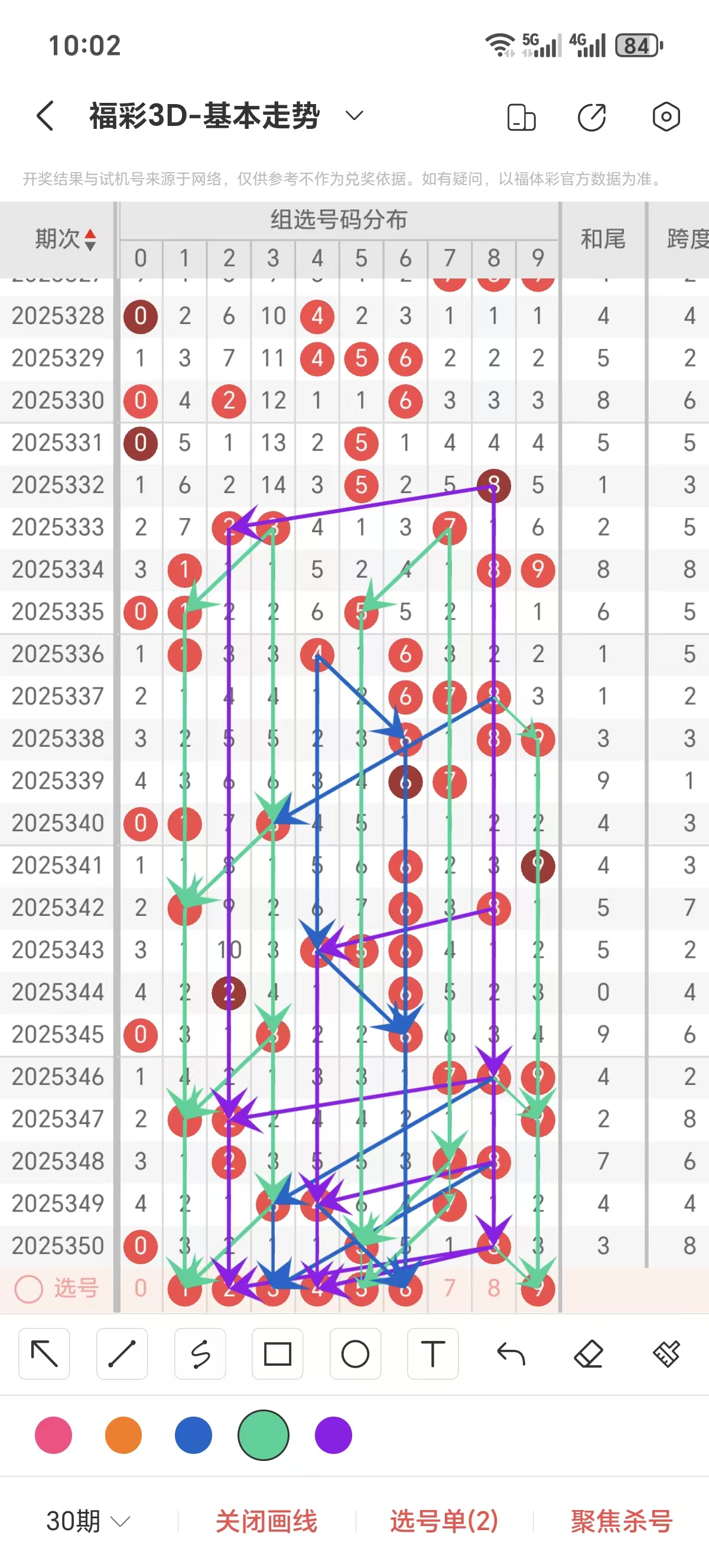 跨度通常情况下在五期之内重复一个跨度的概率很高,近五期重复了8的跨度,近五期跨度为2/8/6/4/8,近期2路的跨度较热,上期是2路的跨度,本期要侧重跨度以3/4/5跨为主的号码组合。可以从跨度方面选择相应的双胆码组合,双胆码的选取要根据近期和历史的走势进一步的分析选取。