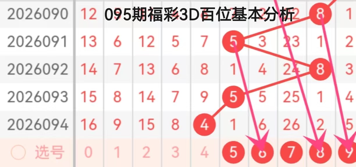 本次分析基于2026090-094期百位开奖数据,结合图中走势连线与箭头指向,综合研判095期百位号码趋势。