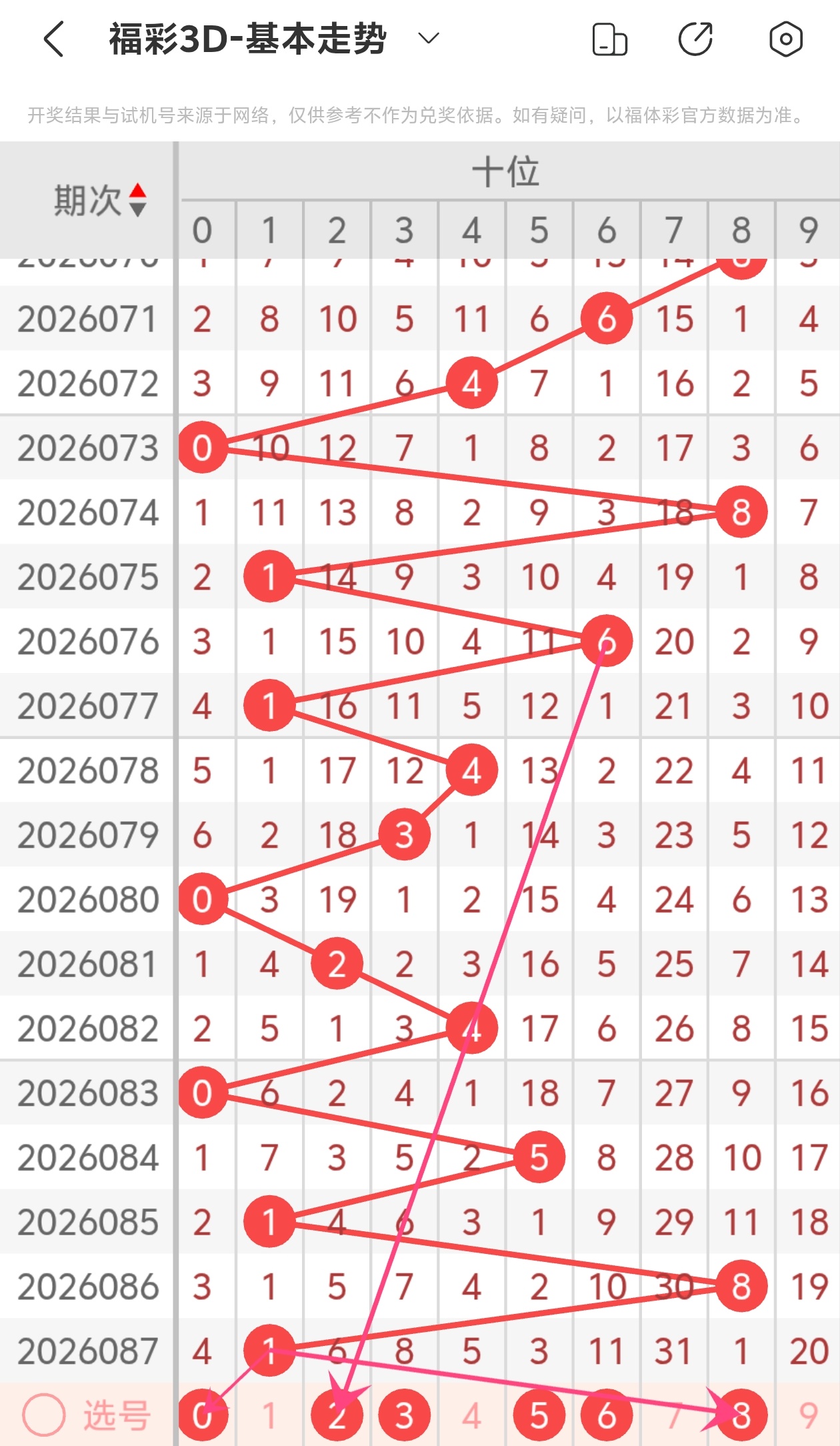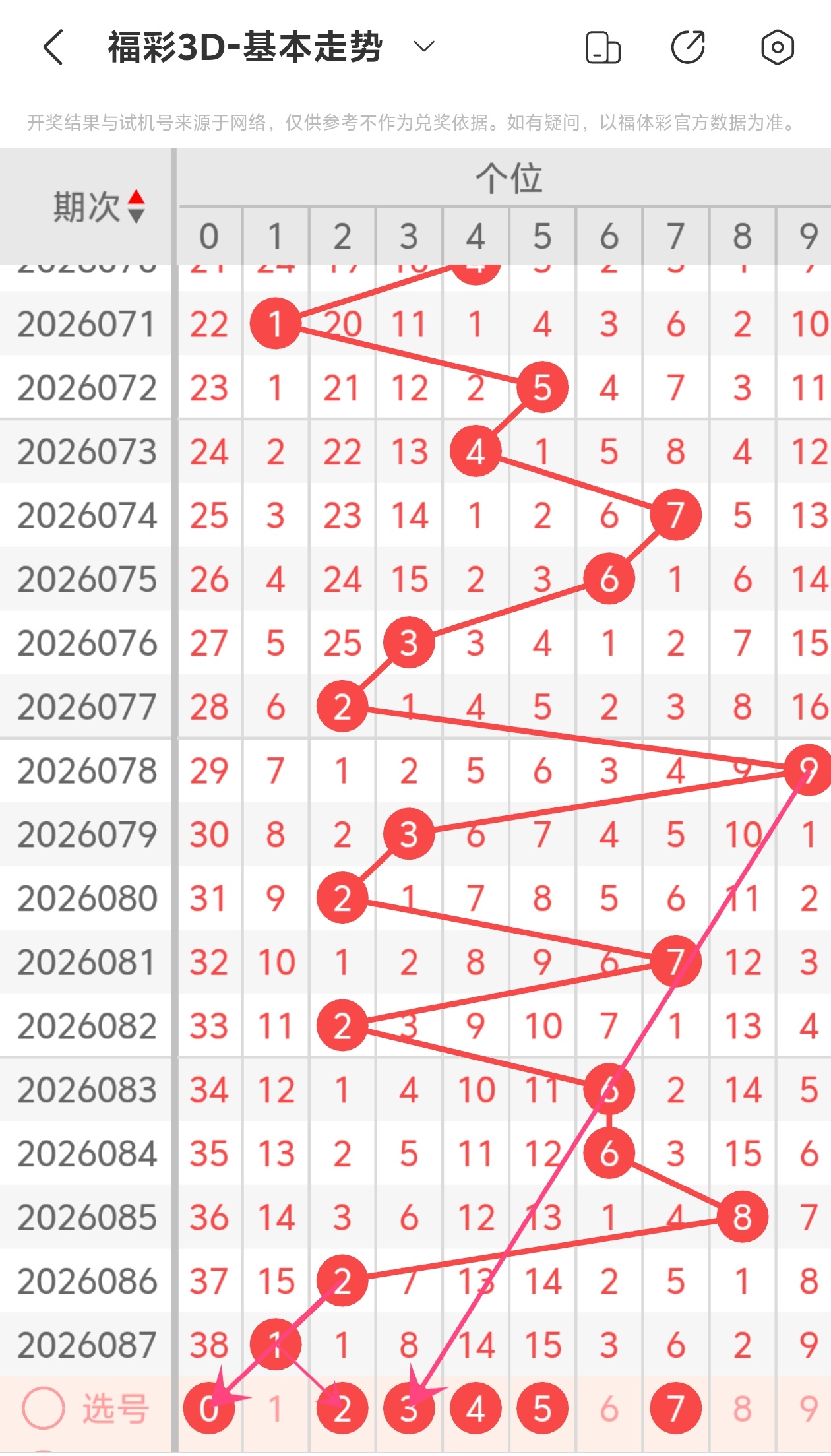 上期个位开出1,本区与上期的跨度为1,本期我们可以从上面走势图中看出选号的思路,0为斜连走势跨度为一,2为分边走势,3为斜连走势跨度为二,综合以上分析,本期个位推荐:023457