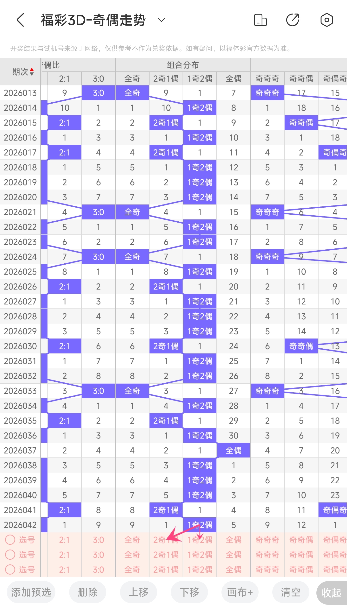 上期开了1奇2偶的情况,往前一期开出的是2奇1偶。从组合数学理论上来讲,开出2奇1偶和1奇2偶的概率都为37.5%,开出全偶和全奇的概率为12.5%。通过分析目前30期内的数据。本期的开出全偶的概率是3.33%,开出全奇的概率为13.33%,开出1奇2偶的概率为63.33%,开出2奇1偶的概率是20%。和前一期相比,概率没有发生变化。通过走势图分析,上期开了1奇2偶,本期看好2奇1偶回补。所以本期推测可能开2奇1偶,其次是1奇2偶,然后是全奇或者全偶类型。