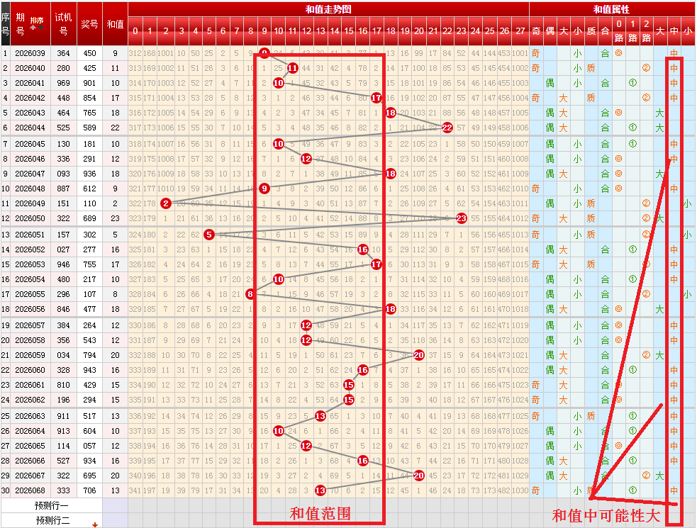 从上图可以开出,按和值大(18-27)中(9-17)小(0-8)分区,上期开出和值中,按近期趋势和跟随表现,本期继续和值中可能性大,和值大致在9-17间。